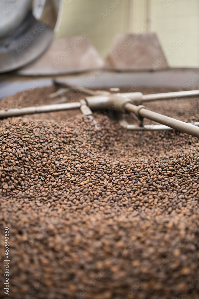 Close-up of brown coffee beans in roasting machine. Interior of coffee production workshop with set up roasting equipment. Production, industry, manufacturing process concept
