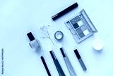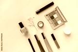 make up and cosmetic products flat lay on beige background