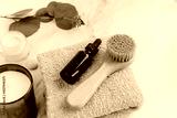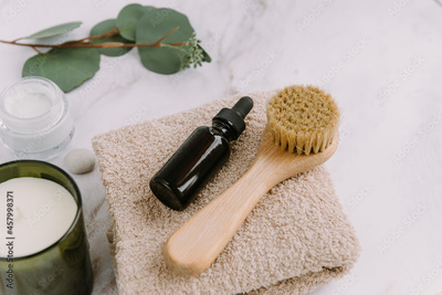 Skin care products - body or face brush and serum bottle on beige towel, aroma candle and cream for sensitive skin - spa and relaxation products