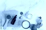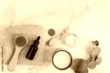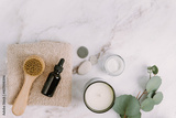 Skin care products flat lay - body or face brush and serum bottle on beige towel, aroma candle and cream for sensitive skin - spa and relaxation products