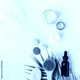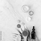 face brush and bottle with serum on palm tree leaf - beauty and spa concept flat lay