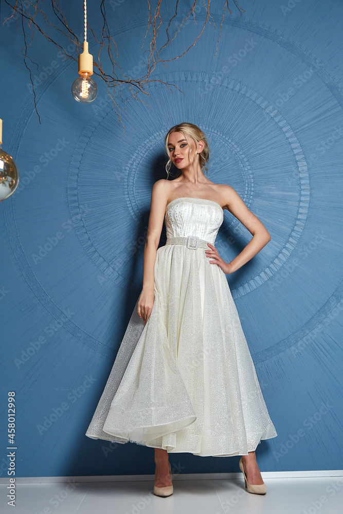 Beautiful tender young woman sexy blond bride in a luxury white wedding dress lace chiffon Summer happiness awaits the groom before the wedding ceremony makeup accessory jewelry smile.