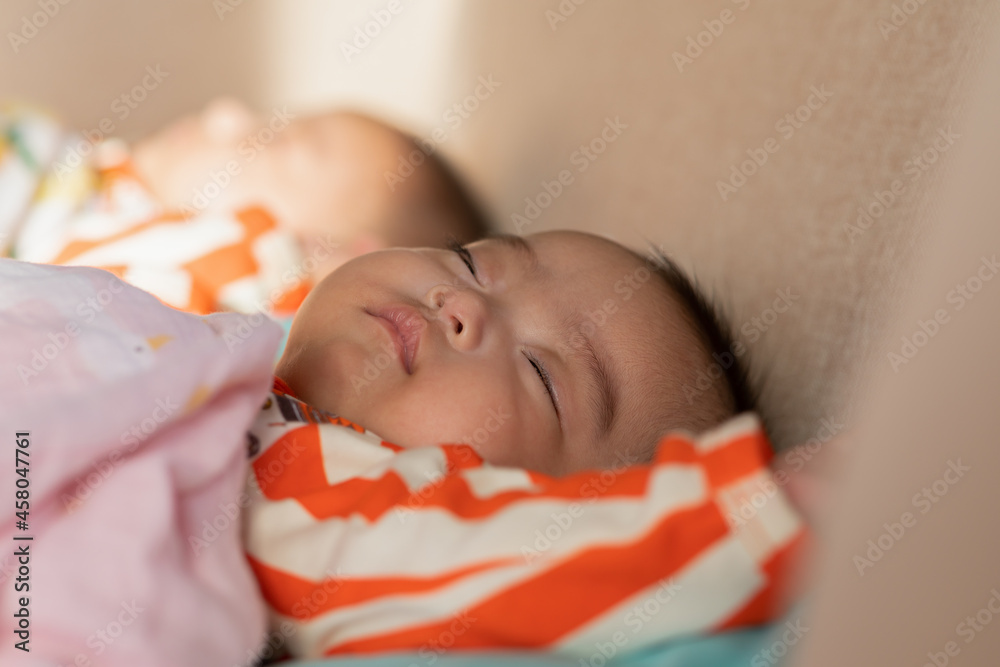 Adorable Asian baby girl lying on bed close eyes with natural light in the morning.Cute little baby smiling and happiness relaxing in bed.Portrait of asian baby newborn sleep in bedroom