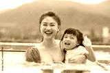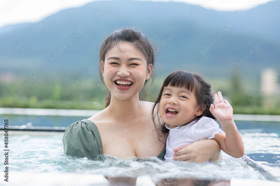 Adorable kid girl smiling her mother with love and happiness feeling in swimming pool.Asian young mother smile with her sweet little girl kiss on her cheek.Love and family concept