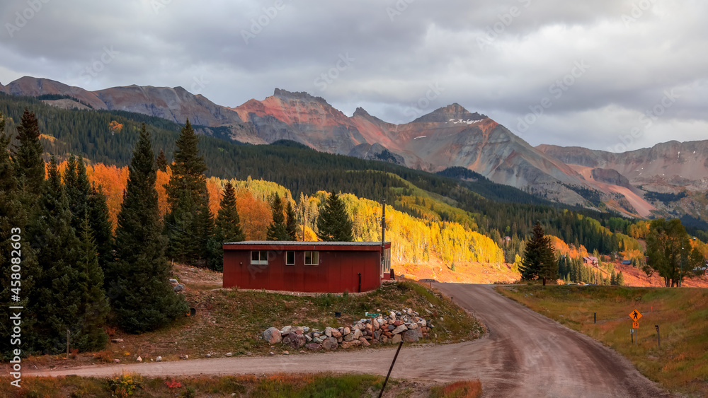 Visitor center at Trout lake recreation area in San Juan mountains of Colorado during autumn time