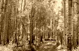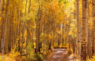 Bright Aspen trees along rural drive in Colorado during autumn time