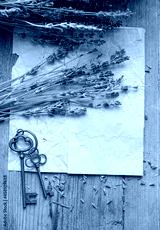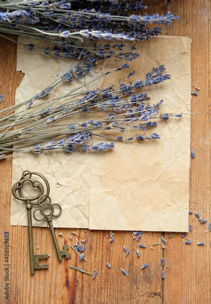 lavender flowers, bronze vintage keys and old paper on rustic wooden table. romantic nostalgic composition. flat lay. copy space. flat lay