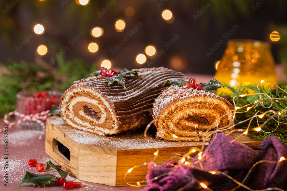 Traditional Christmas cake, chocolate Yule log with festive decorations