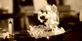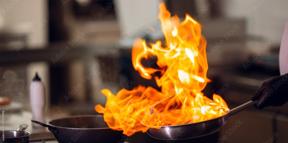 Modern kitchen. Cooks prepare meals on the stove in the kitchen of the restaurant or hotel. The fire in the kitchen.