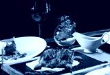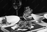Grilled partridge, sea bass, Tartarus. Different dishes on the table in the restaurant.