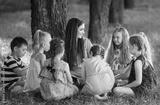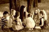 Children and education, young woman at work as educator reading book to boys and girls in park.