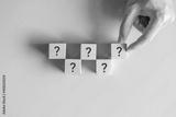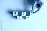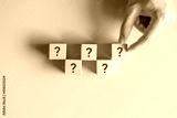 Wooden cube block shape with sign question mark symbol on blue background.