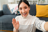 Cheerful beautiful Asian woman looking and talk to camera at video calling recording with online chat on sofa at house.