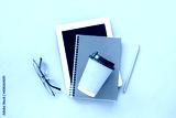 Tablet computer, blue notepad, glasses and yellow coffee cup on the table. Study concept. Top view, flat lay