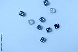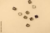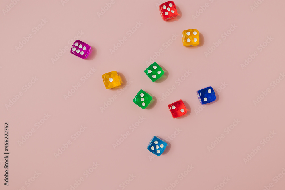 Trendy seamless pattern made with different vibrant colors play dice on a pastel pink background. Lucky chance and gambling game backdrop.