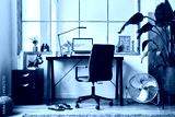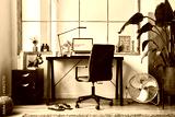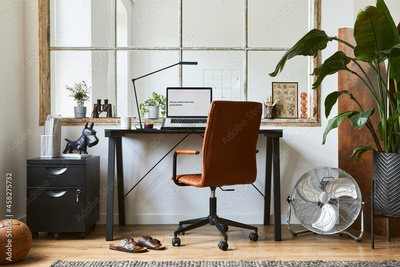 Creative composition of modern masculine home office workspace interior design with black industrial desk, brown leather armchair, laptop and stylish personal accessories. Template.
