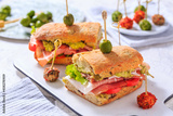 Ciabatta sandwich with guacamole, prosciutto, lettuce and tomato
