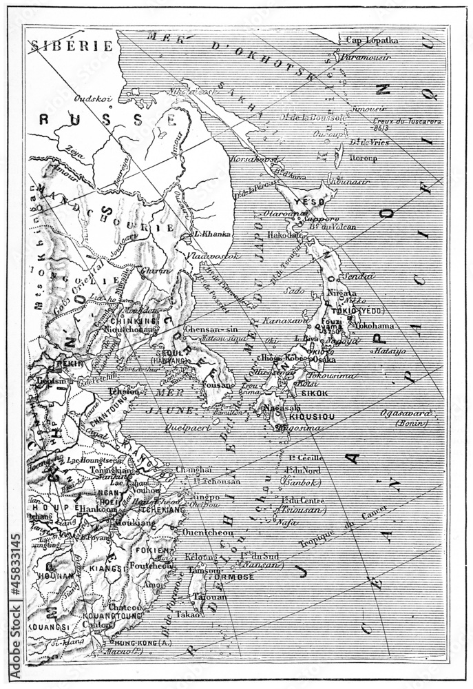 Map of Japan, Korea, China, vintage engraving.
