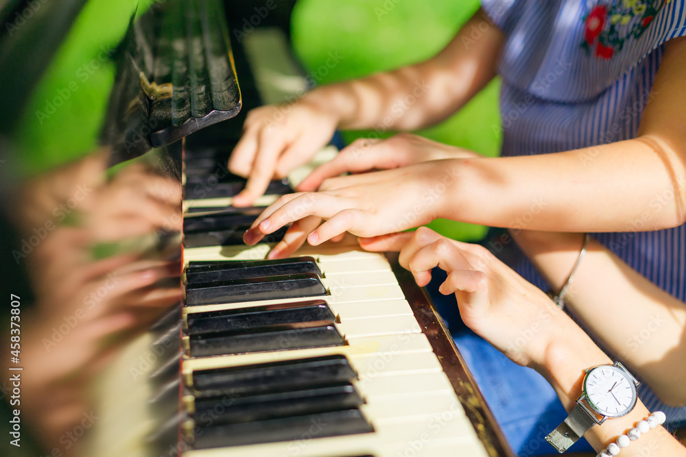 hands of a young pianist teacher teaches a girl student to play the piano, the concept of music education, love of art.