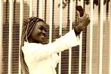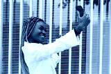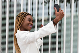 African american young woman smiling taking a selfie with mobile phone. Blonde braids and white blazer.
