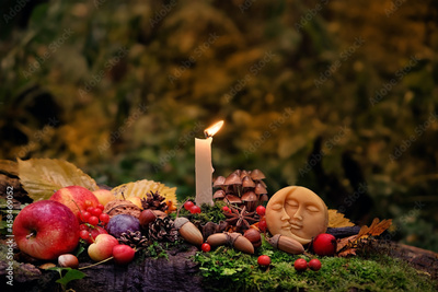 Moon amulet, candle, autumn leaves, fruits, berries, nuts in mysterious forest. Wiccan altar for Mabon sabbat. autumn equinox holiday. Witchcraft, esoteric spiritual ritual