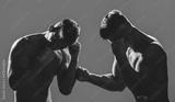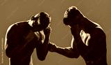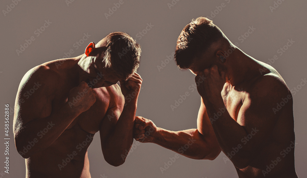 Two professional boxer boxing. Two young boxers facing each other in a match. Two men boxers boxing on isolated silhouette background. Two men exercising thai boxing in silhouette, MMA