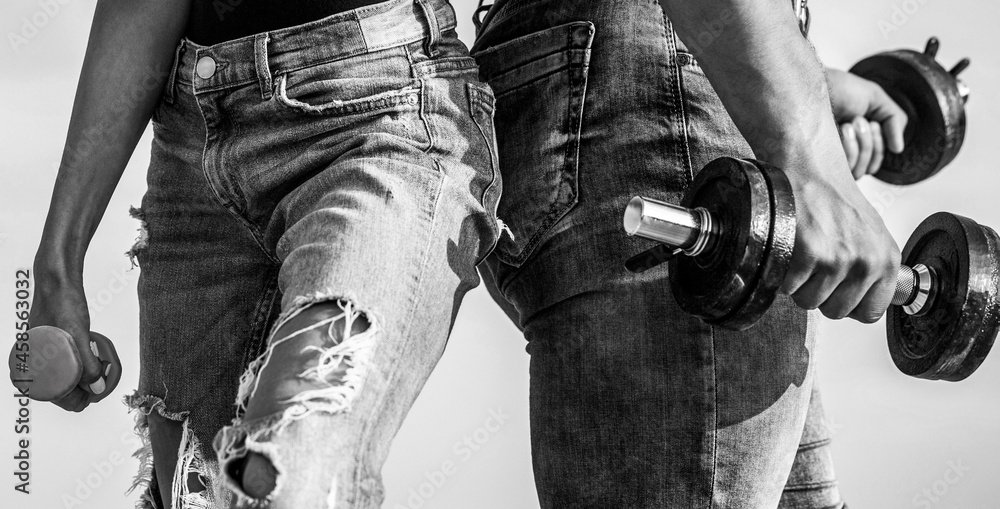 Sport, dumbbell, fitness, couple sports. Sportive woman and man, team