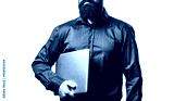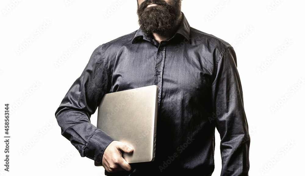 Holding laptop computer. Serious handsome bearded man worker laptop. Bearded male businessman holding a computer in his hands isolated on white background. Businessman using his laptop, pc.