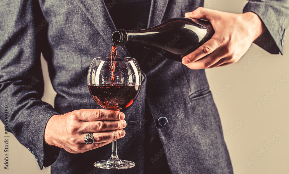 Red wine is poured from bottle to glass. Gourmet drink bottle, red wine glass, sommelier, tasting. Waiter pouring red wine in a glass. Sommelier man, degustation, winery, male winemaker