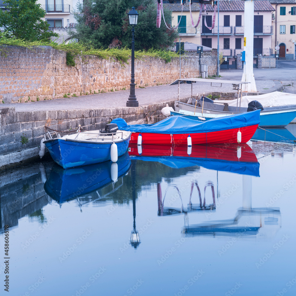 two boats and street lighter with reflections in water in city Capodimonte in Lazio in Italy