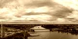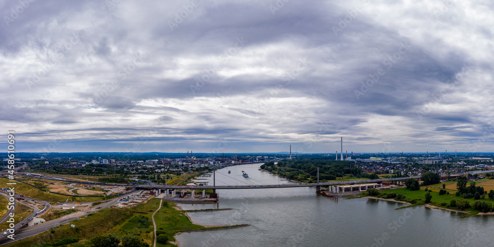 Panoramic view of the Rhine motorway bridge near Leverkusen, Germany. Drone photography.