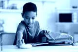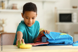 Cute little boy putting his school lunch in bag
