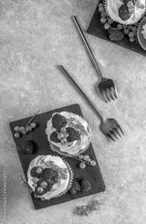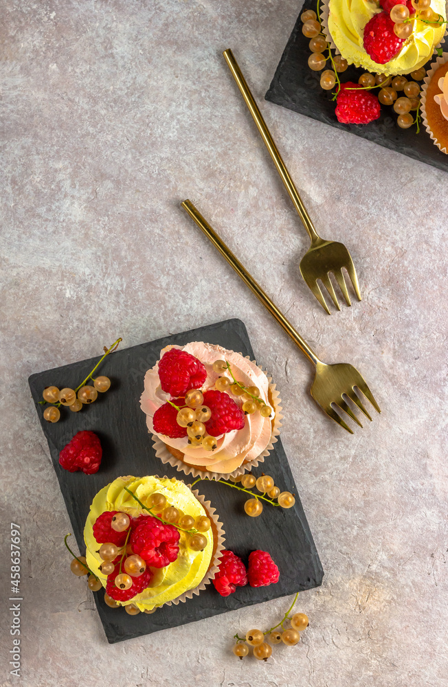 Delicious cupcakes with fresh raspberries and currants on on black slate over light beige background.