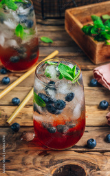 Blueberry ice mojito with mint in tall glasses on rustic wooden background.