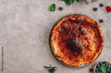 Basque Burnt Cheesecake. Tarta de Queso. The whole cake on light stone background.