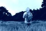 Outdoors adventure trek activity hiker wearing yellow waterproof raincoat enjoying rainy weather.