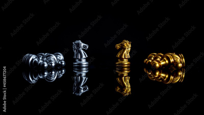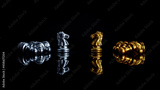 Chess board game between silver team and golden team by king golden team is stategy game as business challange competitive game ,this business stategy plan concept with black background.