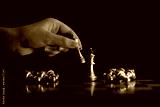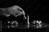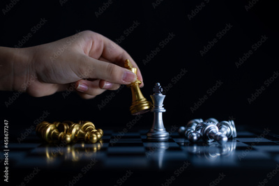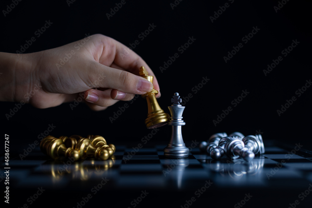 Chess board game between silver team and golden team by king golden team is stategy game as business challange competitive game ,this business stategy plan concept with black background.