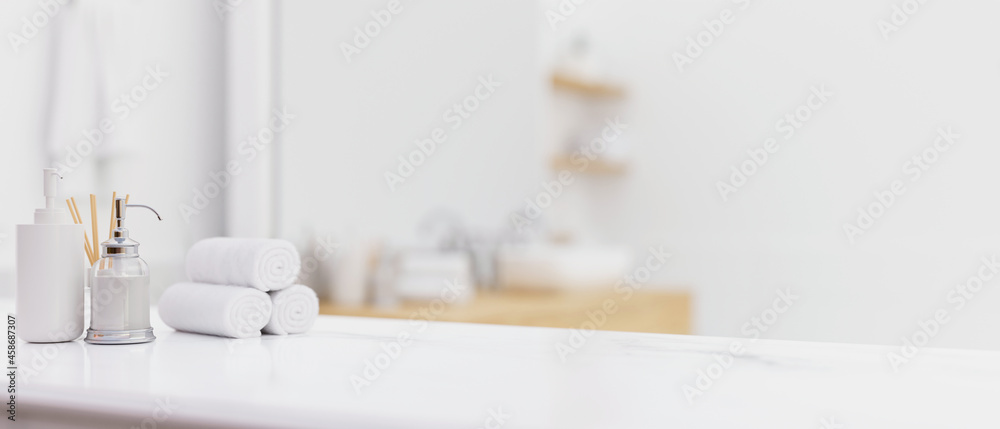 White table top with toiletries over blurred modern bright white bathroom