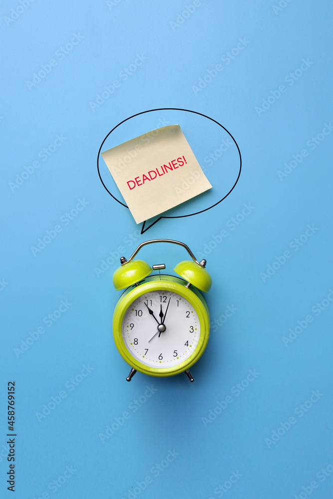 A green alarm clock and the inscription: deadline! A reminder symbol for deadlines in the work