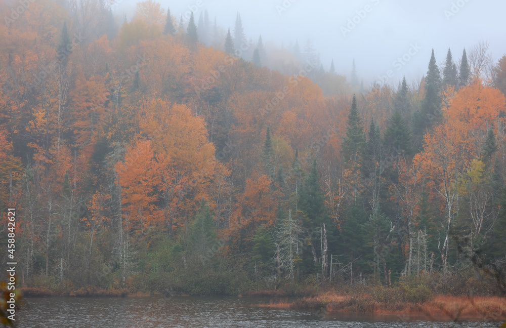 Colorful autumn forest covered in dense fog in Quebec countryside