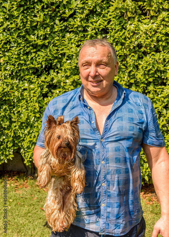 Mature man with Yorkshire terrier dog wet in water on a hot day in the garden.