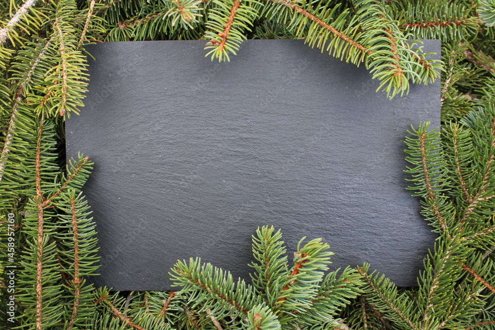 Arrière plan ardoise et branches de sapin, avec espace pour du texte
