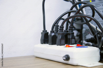 Old and damaged electric adapter power plug has many appliances are plugged outlet socket concept of risk danger overloaded current electrical.