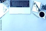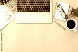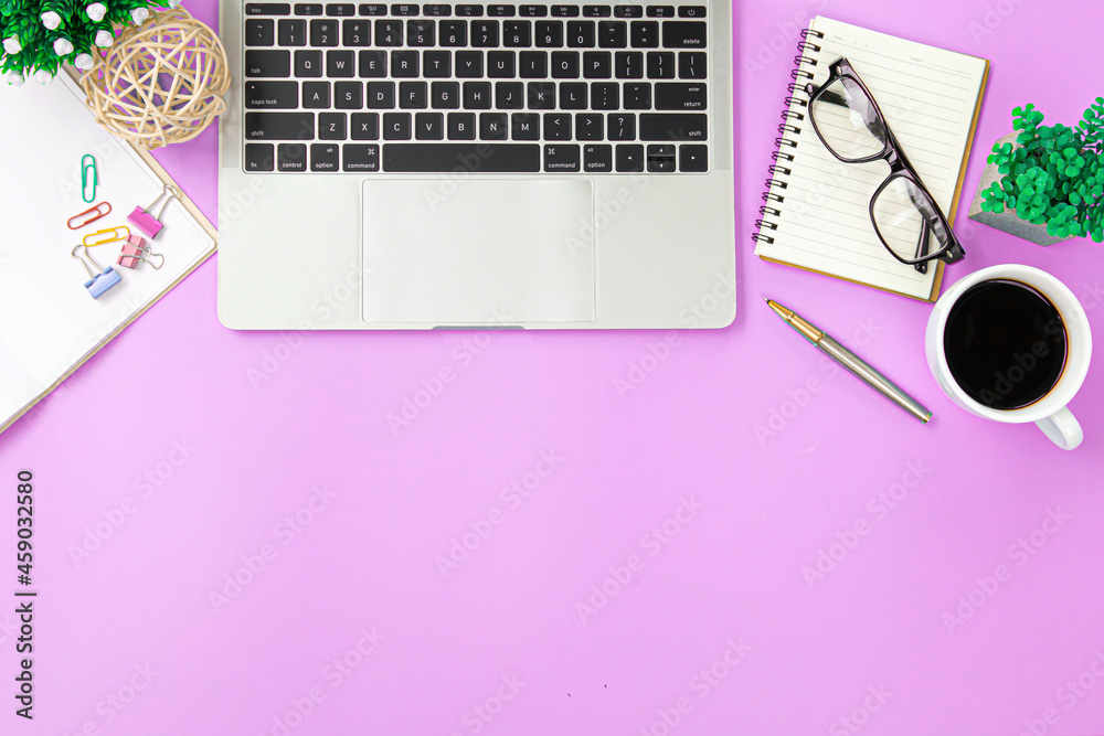 Top view desk or top view table or modern office desk flat lay background with computer laptop and office equipment for work area copy space and education school concepts.