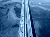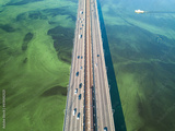 South bridge in Kiev. Algae bloom in the water of the Dnieper River. Aerial drone view.