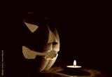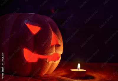 A glowing carved pumpkin and a candle in a dark background - halloween concept