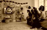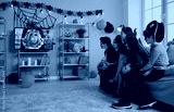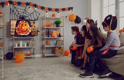 Kids in spooky costumes of witches, pirates and vampires together watching children's Halloween movie sitting on sofa in interior with festive orange black pumpkin decor at fancy dress party at home