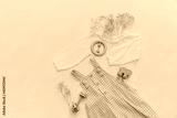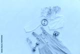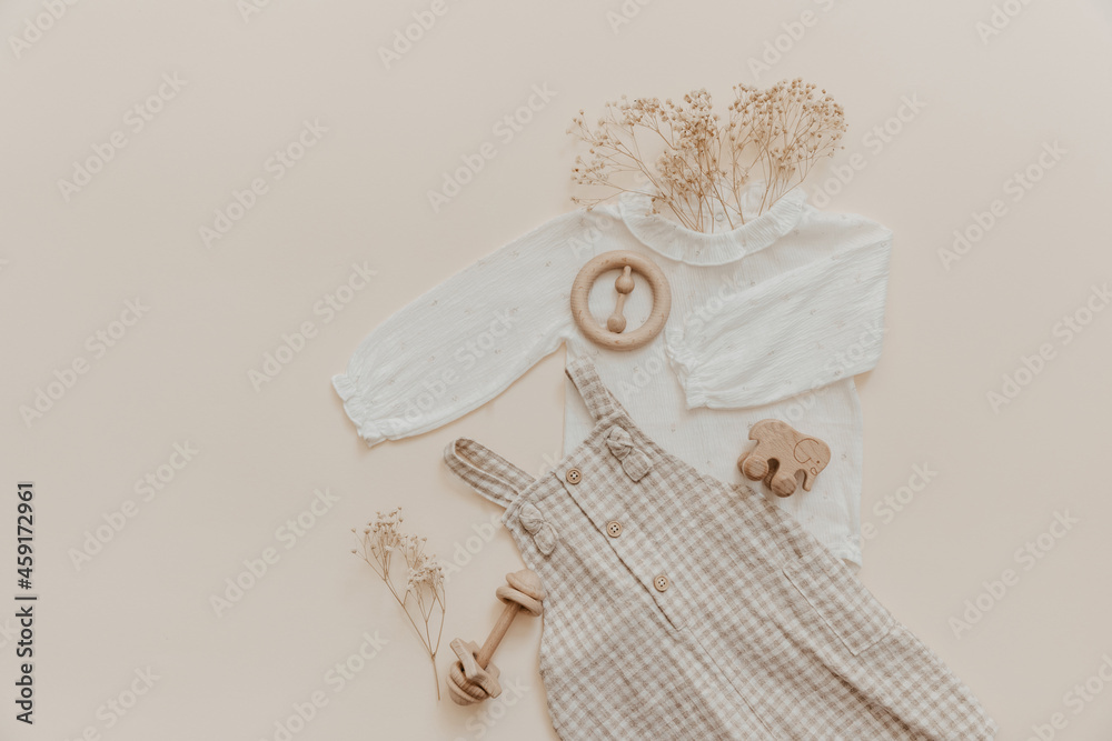 Flat lay Baby natural material accessories concept. Wooden toys, clothes and shoes on beige background. Bohemian baby fashion.