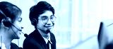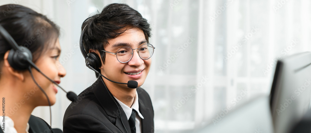 Smiling Asian businessman consultant wearing a microphone headset of customer support phone operator at the workplace.
